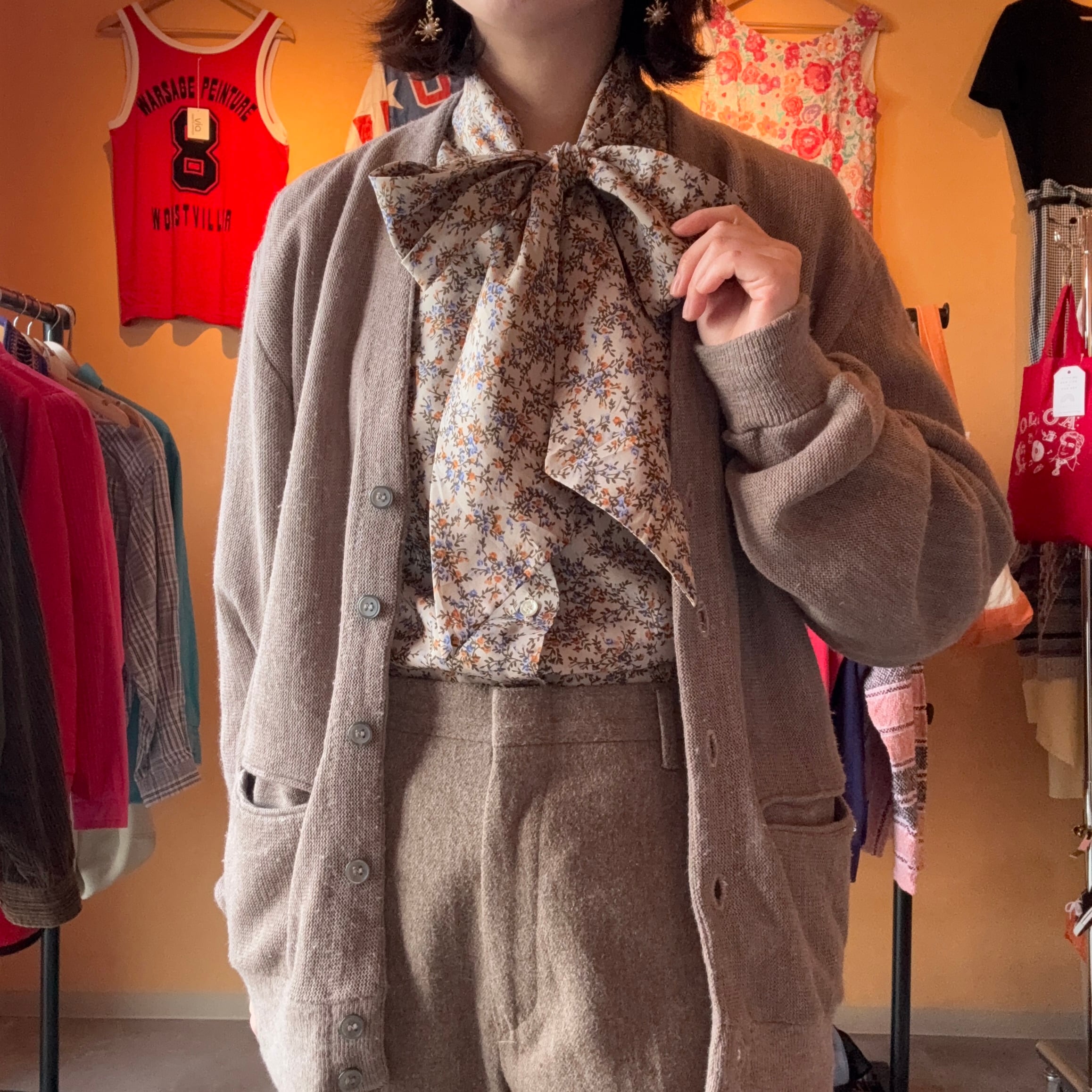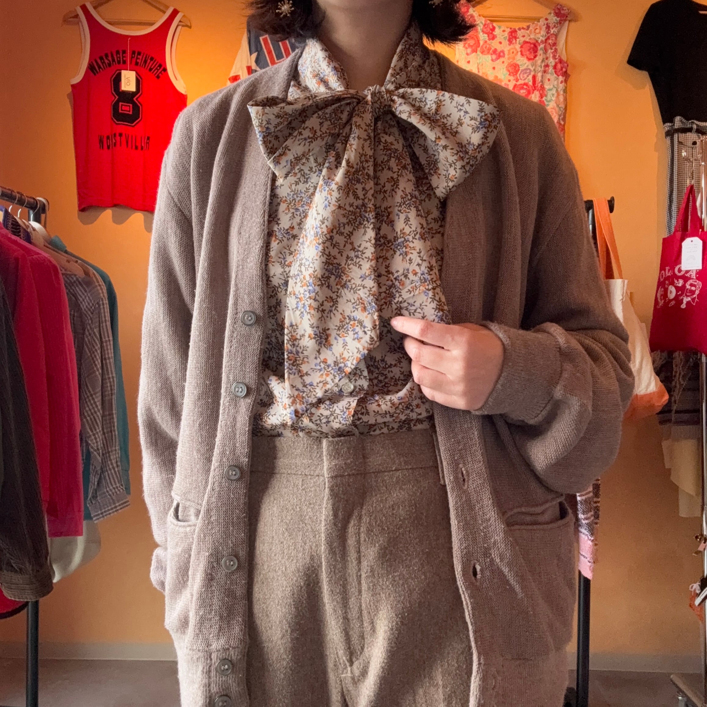 カーディガンやベストと合わせるとボウタイのシルエットも綺麗に見えますよ♪