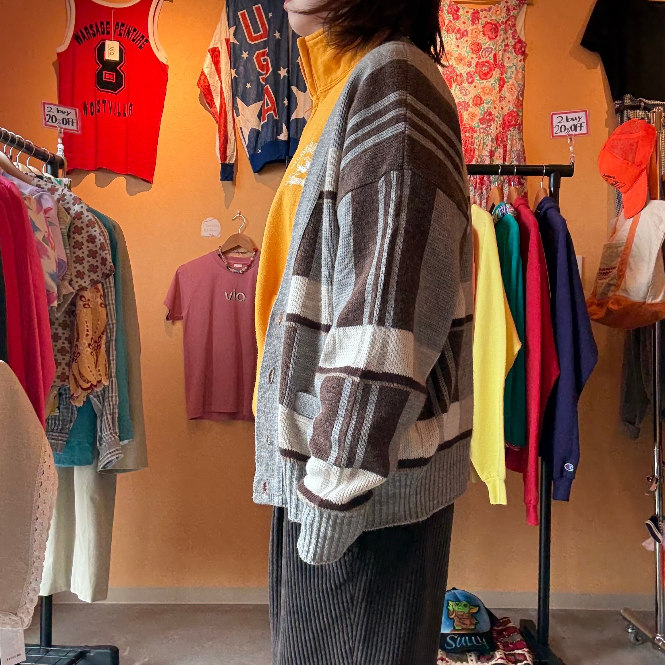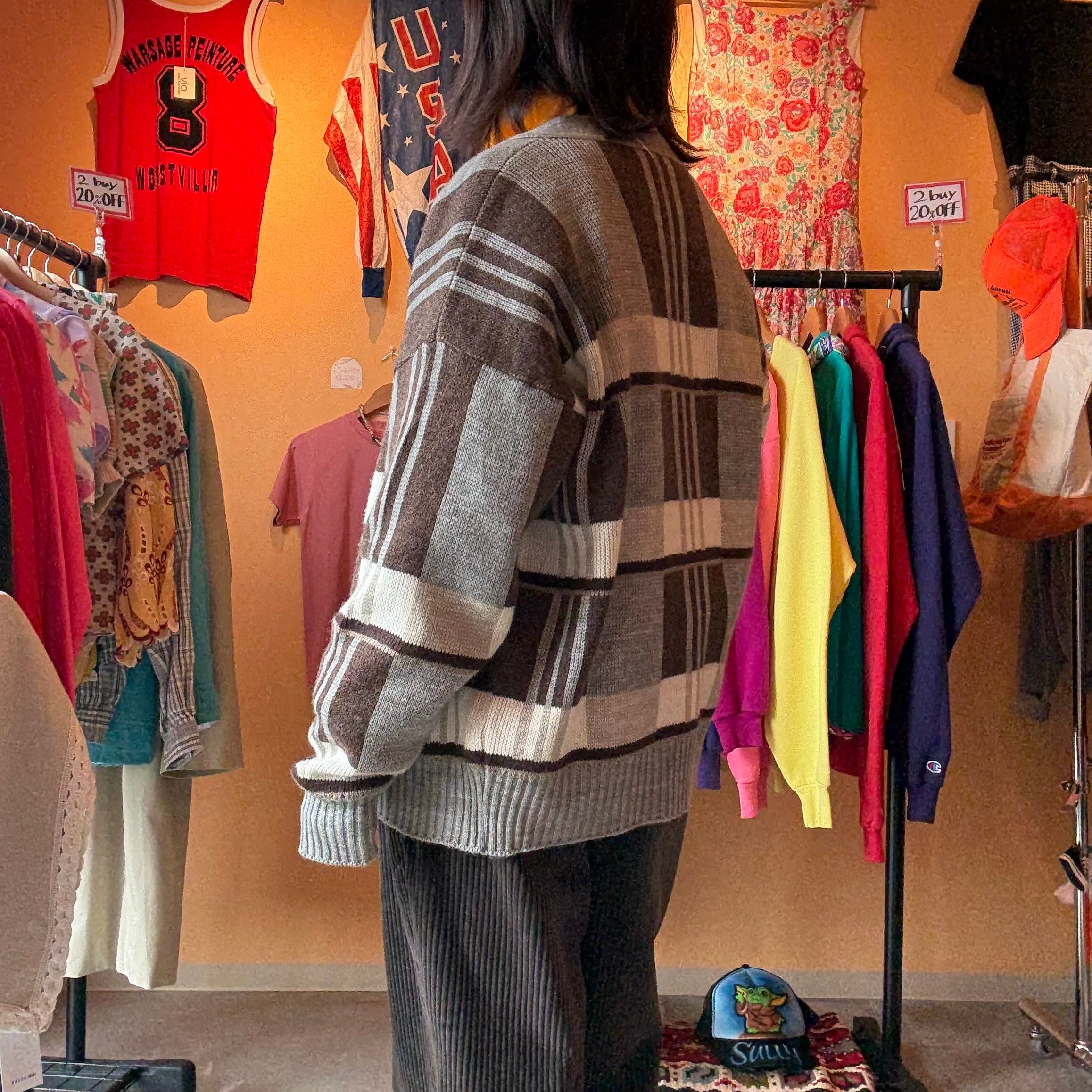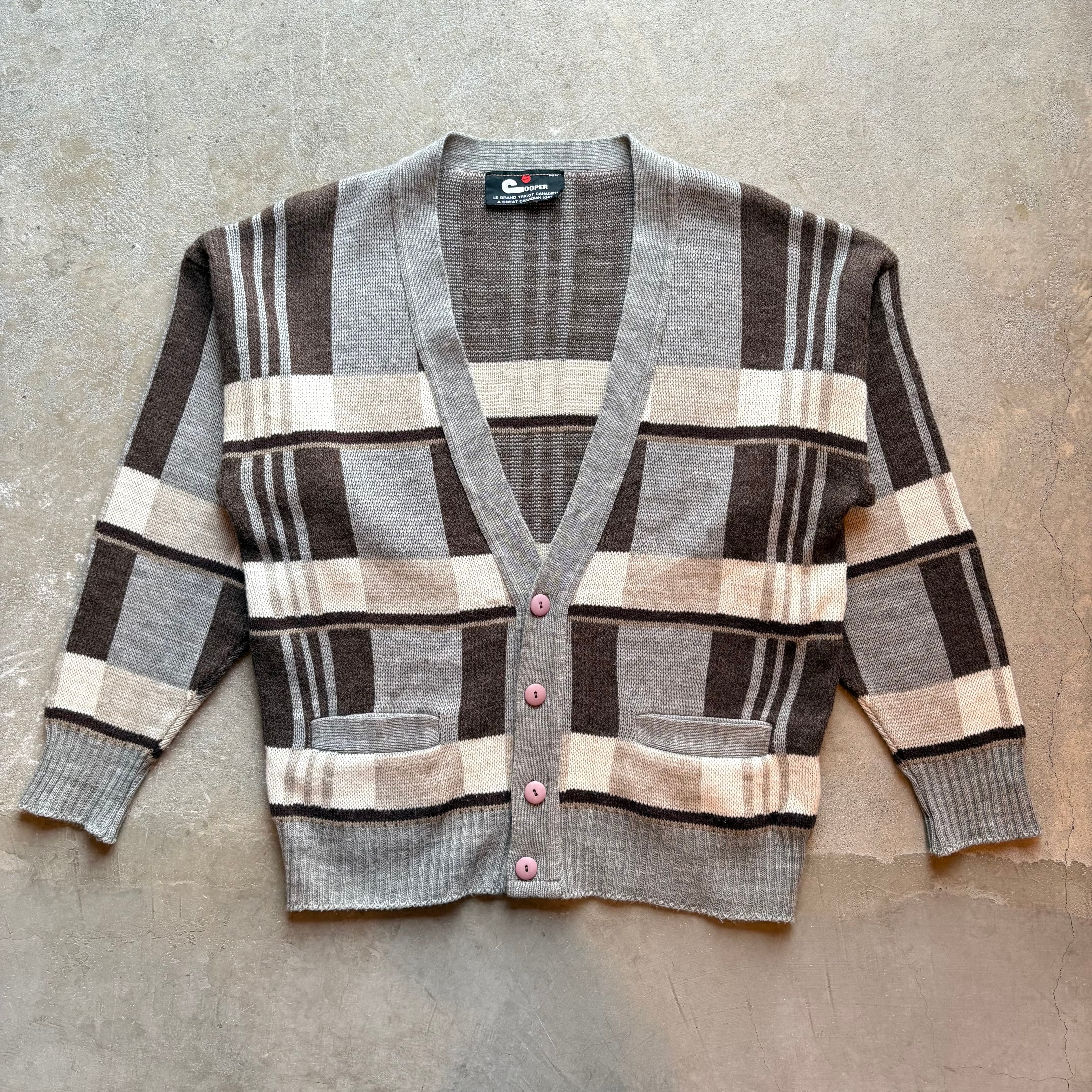 メリハリの効いたチェック柄がお洒落なカーディガンですね。